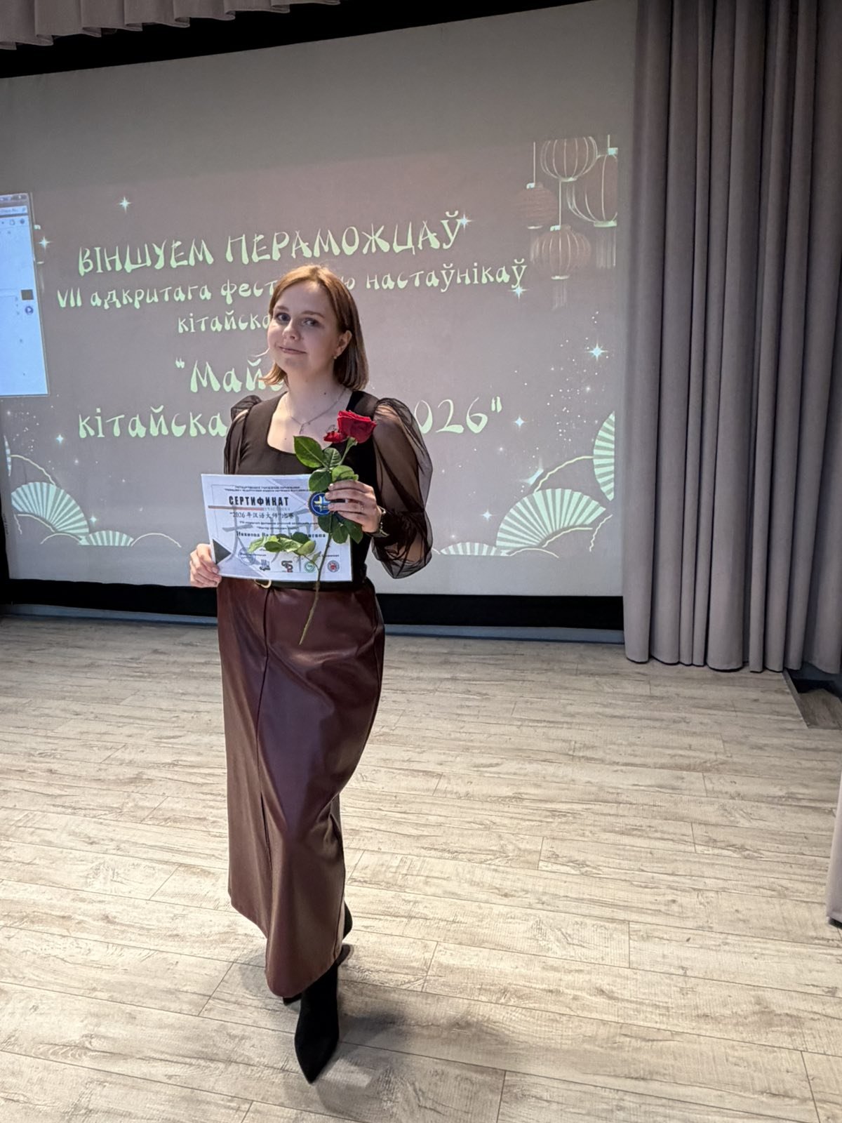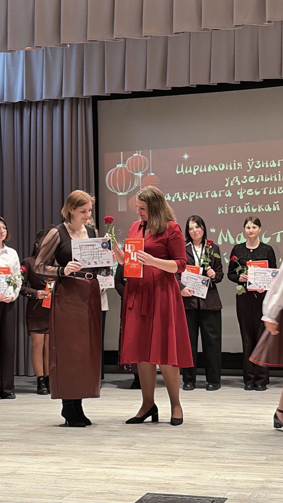 Учитель китайского ГУО “Гимназия №2 имени А.В. Горбатова г. Волковыска Иванова Валерия Дмитриевна приняла участие в VII открытом фестивале учителей китайского языка «Мастер китайского языка». Организатором Фестиваля являются Кабинет Конфуция Республиканского института китаеведения имени Конфуция Белорусского государственного университета в государственном учреждении образования «Гимназия с белорусским языком обучения№ 23 г. Минска» и ресурсный центр общественно-гуманитарного направления «Центр китайского языка и культуры» государственного учреждения образования «Гимназия с белорусским языком обучения№ 23 г. Минска» при поддержке управления по образованию администрации Советского района г.Минска и государственного учреждения образования «Минский городской институт развития образования».
