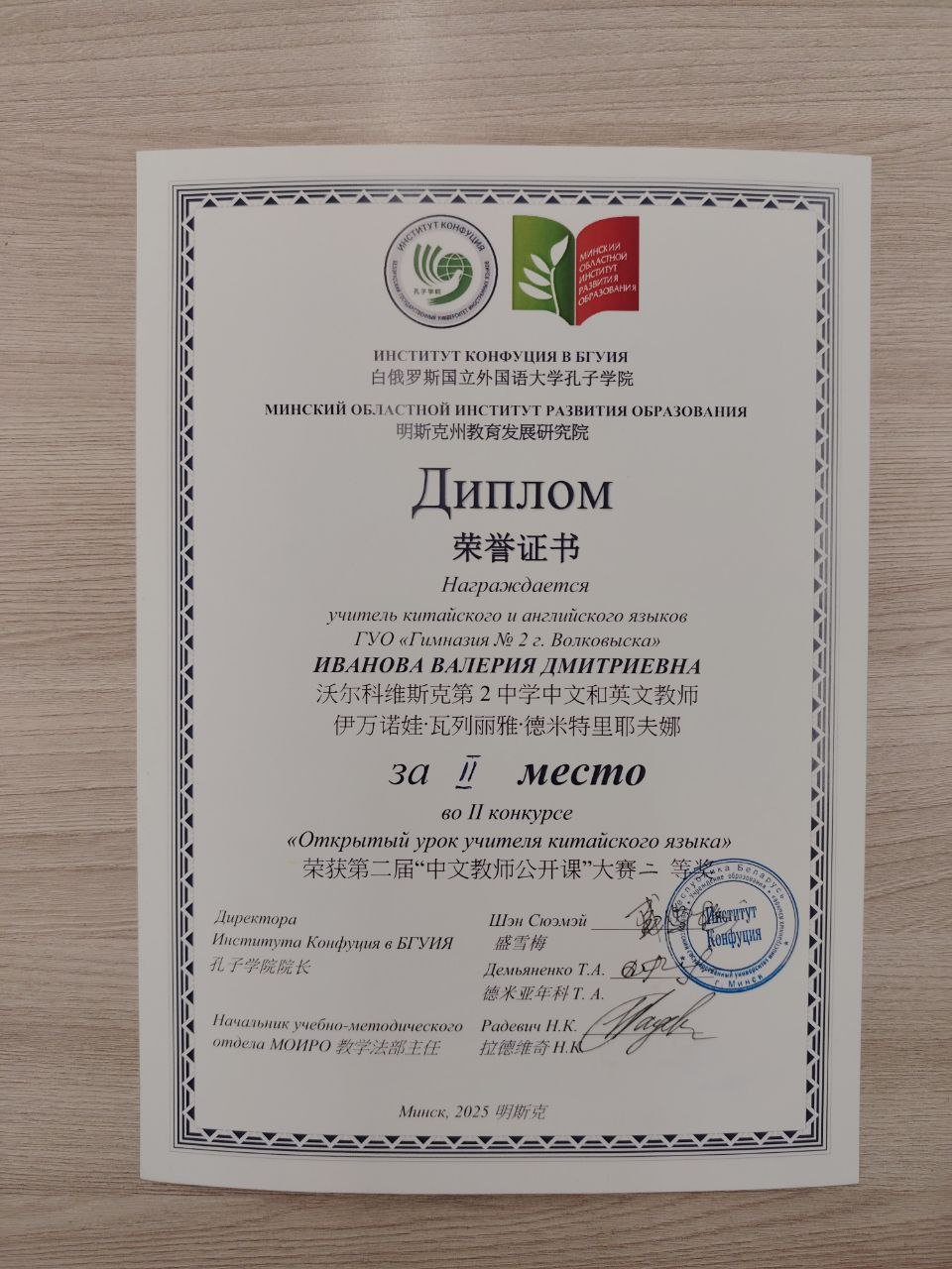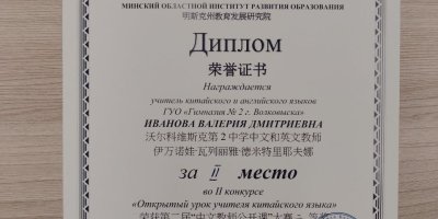 10 декабря 2025 года учитель китайского языка Иванова Валерия Дмитриевна успешно выступила в финале II конкурса «Открытый урок учителя китайского языка» в Республике Беларусь, организованном Институтом Конфуция в БГУИЯ и ГУО «Минский областной институт развития образования».
