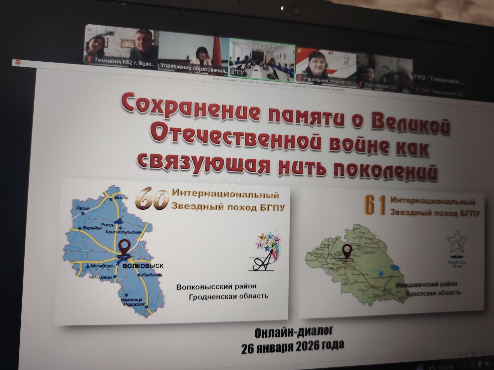 26 января 2026 года #gimn2volk приняла участие в важном онлайн-диалоге с Белорусским государственным педагогическим университетом имени Максима Танка. Мероприятие было организовано в преддверии старта 61-го Звёздного похода по местам боевой и трудовой славы белорусского народа БГПУ (в рамках 60-го похода в 2025 году был посещен Волковысский район).