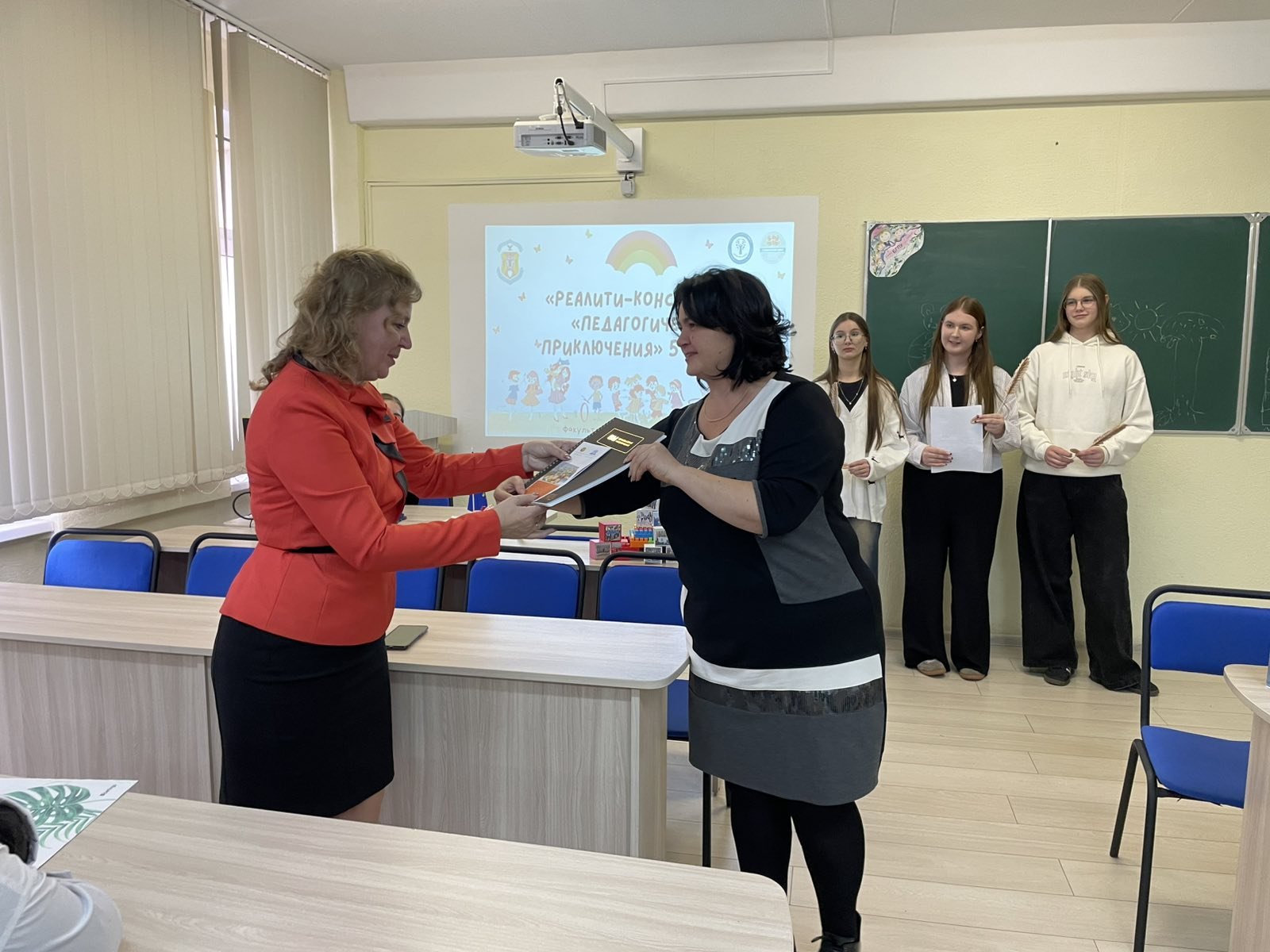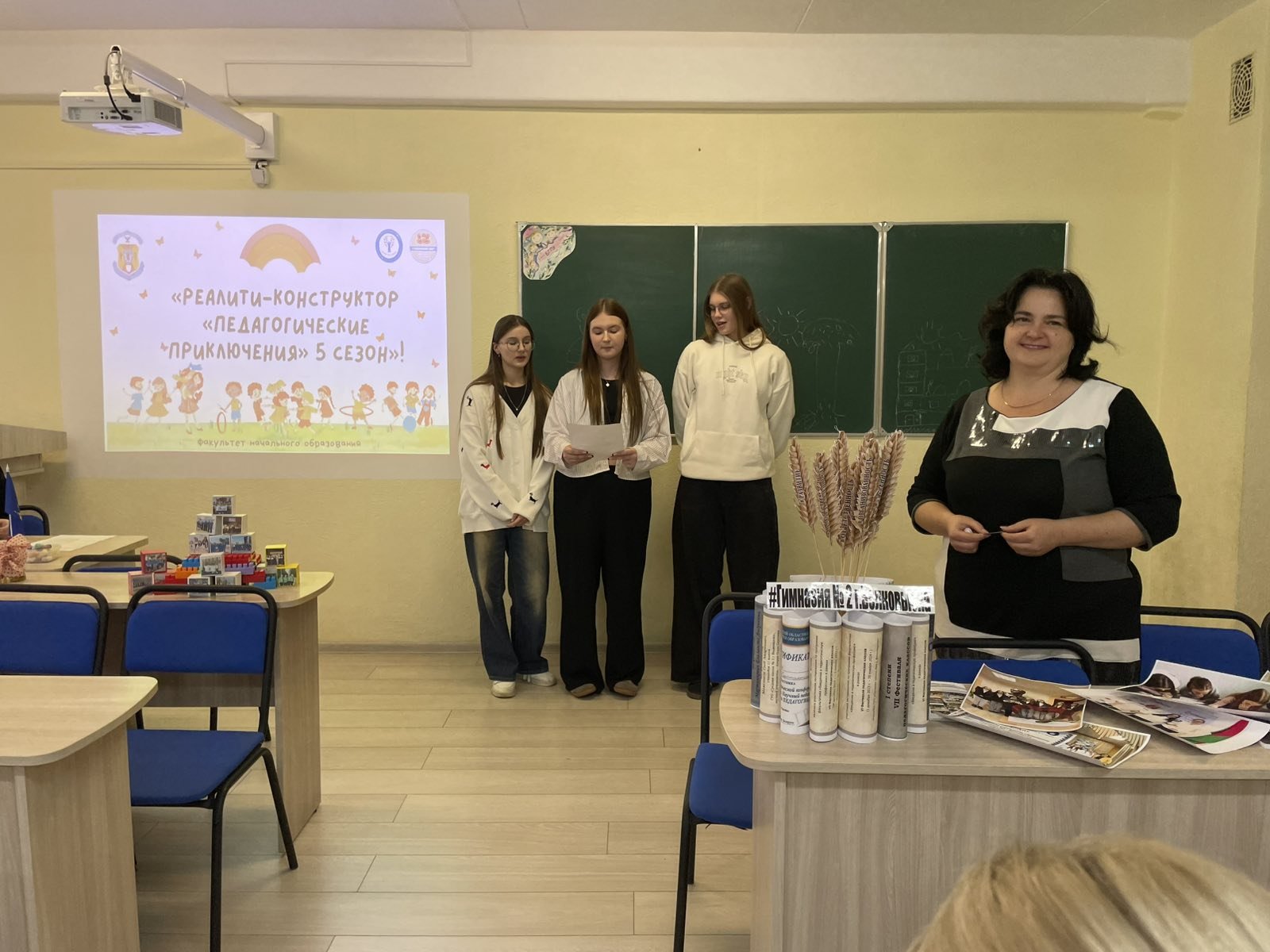 5 ноября команда педагогического класса нашей гимназии в составе Клешторной Ксении, Медведевой Арины, Филоник Натальи и руководителя Командирчик Анны Александровны приняла участие в пятом сезоне проекта факультета начального образования БГПУ им.М.Танка Реалити - конструктор"Педагогические приключения "5 сезон.На первой встрече все участники познакомились,обсудили результаты выполнения первых заданий "Путешествие в Детство", "Вопросы для Почемучек"и просто пообщались в тёплой атмосфере.Проект продолжается. Ждём новых заданий и встреч!