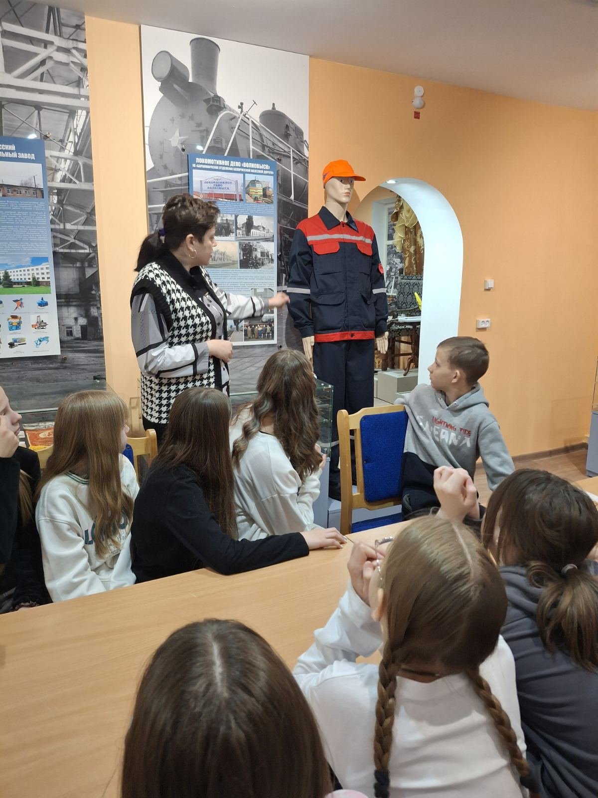 В первом зале экскурсовод познакомила учащихся с историей развития промышленных предприятий города Волковыска: ОАО «Беллакт», ОАО «Волковысский мясокомбинат», ОАО «Красносельскстройматериалы», ОАО «ВолМет», локомотивное депо «Волковыск» и других. Из рассказа Марины Юрьевны учащиеся узнали много нового и интересного об основном ассортименте этих предприятий, а также о странах мира, куда экспортируется их продукция. Это помогло гимназистам лучше понять вклад родного города в экономику Беларуси.