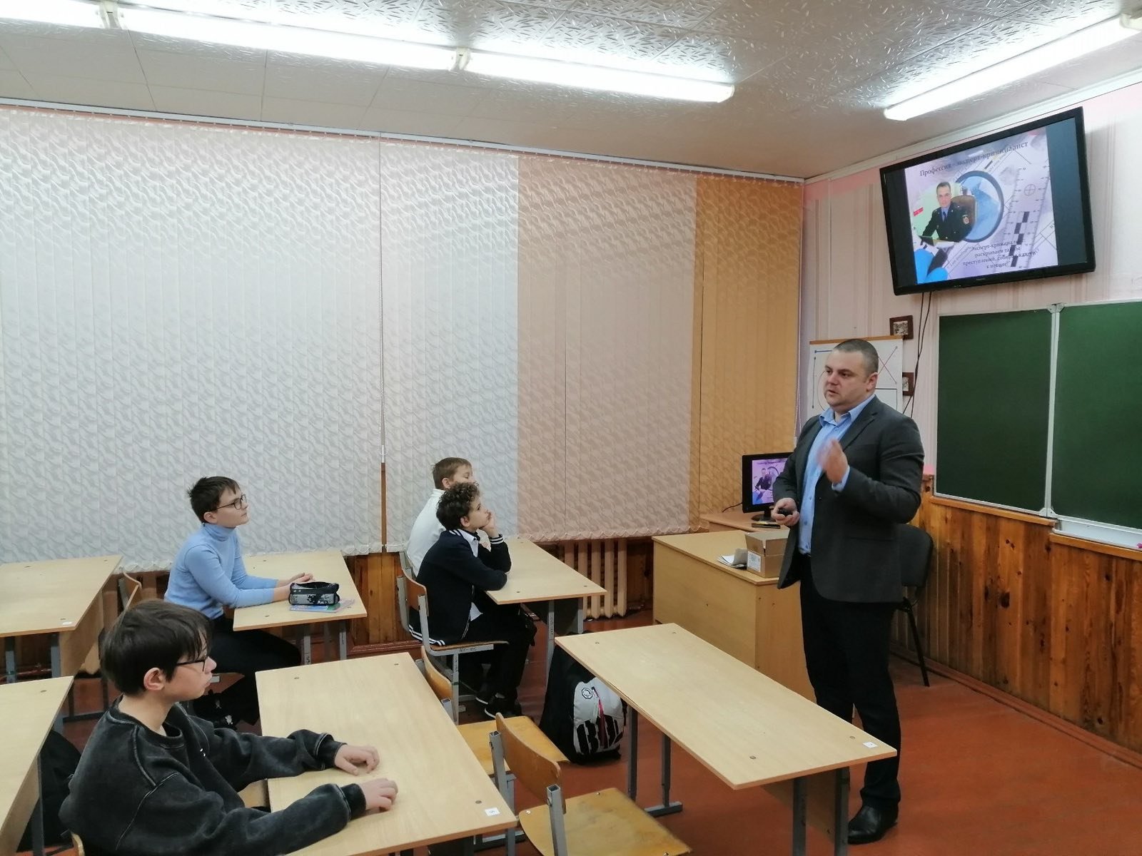 В четверг в VII «В» классе было проведено профориентационное мероприятие с участием руководителя по военно-патриотическому воспитанию Валентина Францевича Бебеха: актуальная встреча «Профессия эксперт».