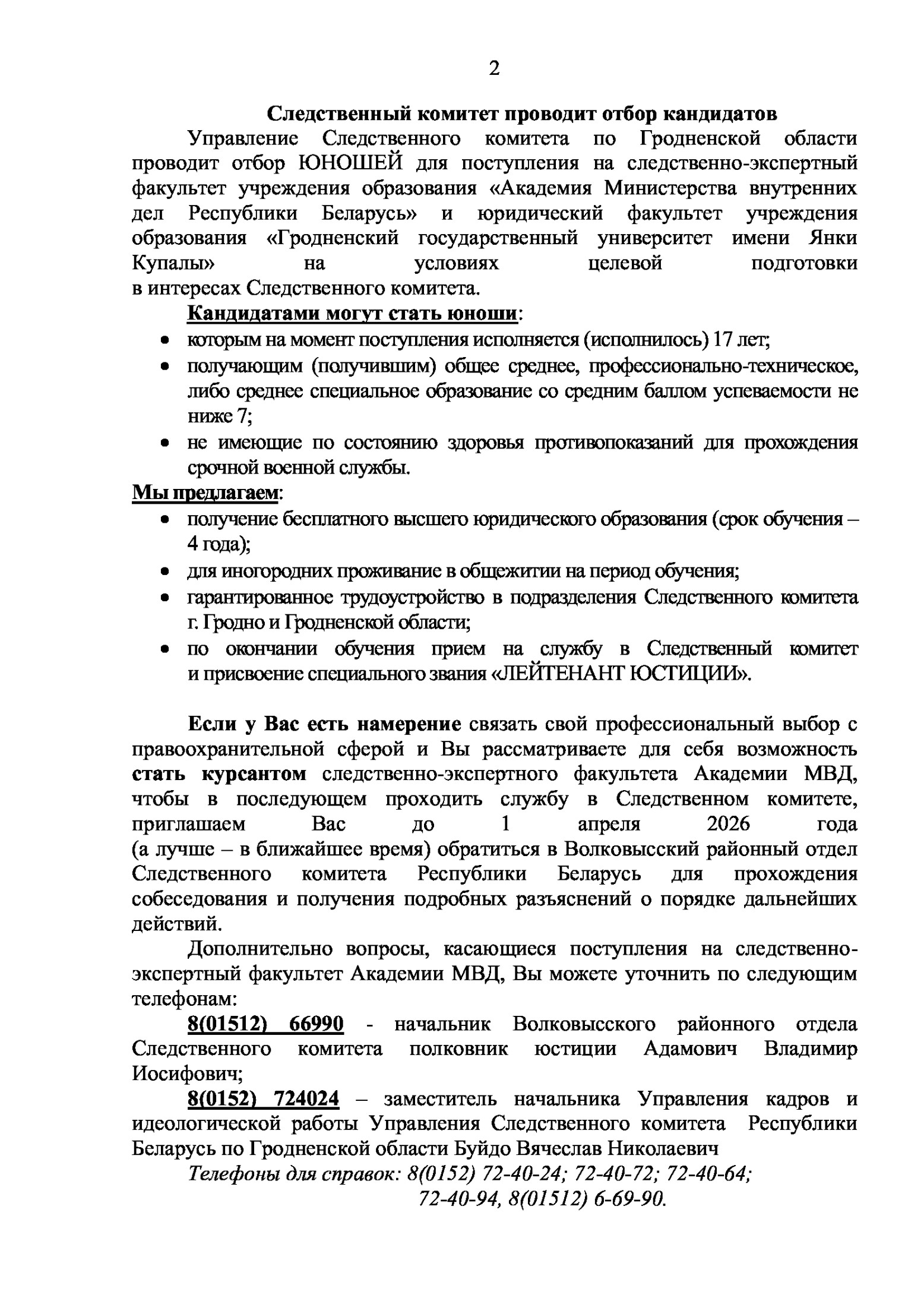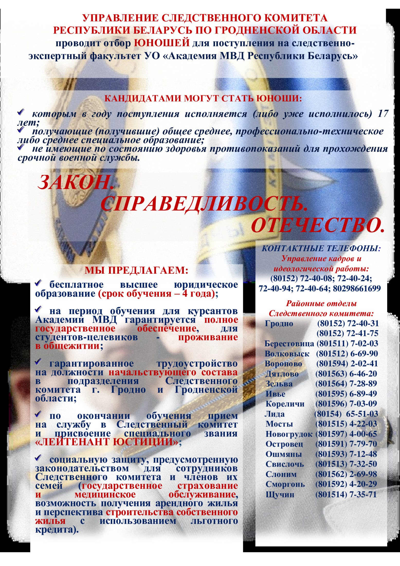 По вопросам поступления на военную службу по контракту Вы можете обратиться по адресу: г.Гродно ул.Богдановича, д. 4, кабинеты № 29 с 8.00 до 17.00 (обеденный перерыв с 13.00 до 14.00) ежедневно, кроме субботы и воскресенья. Справки по телефону: 62 25 39.