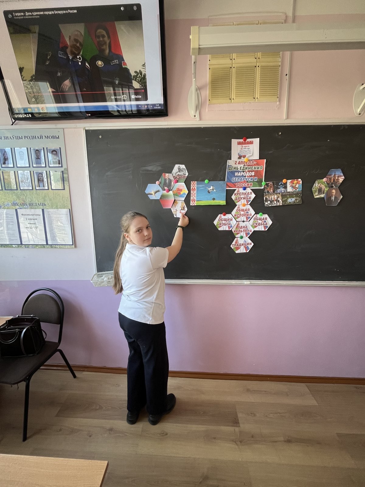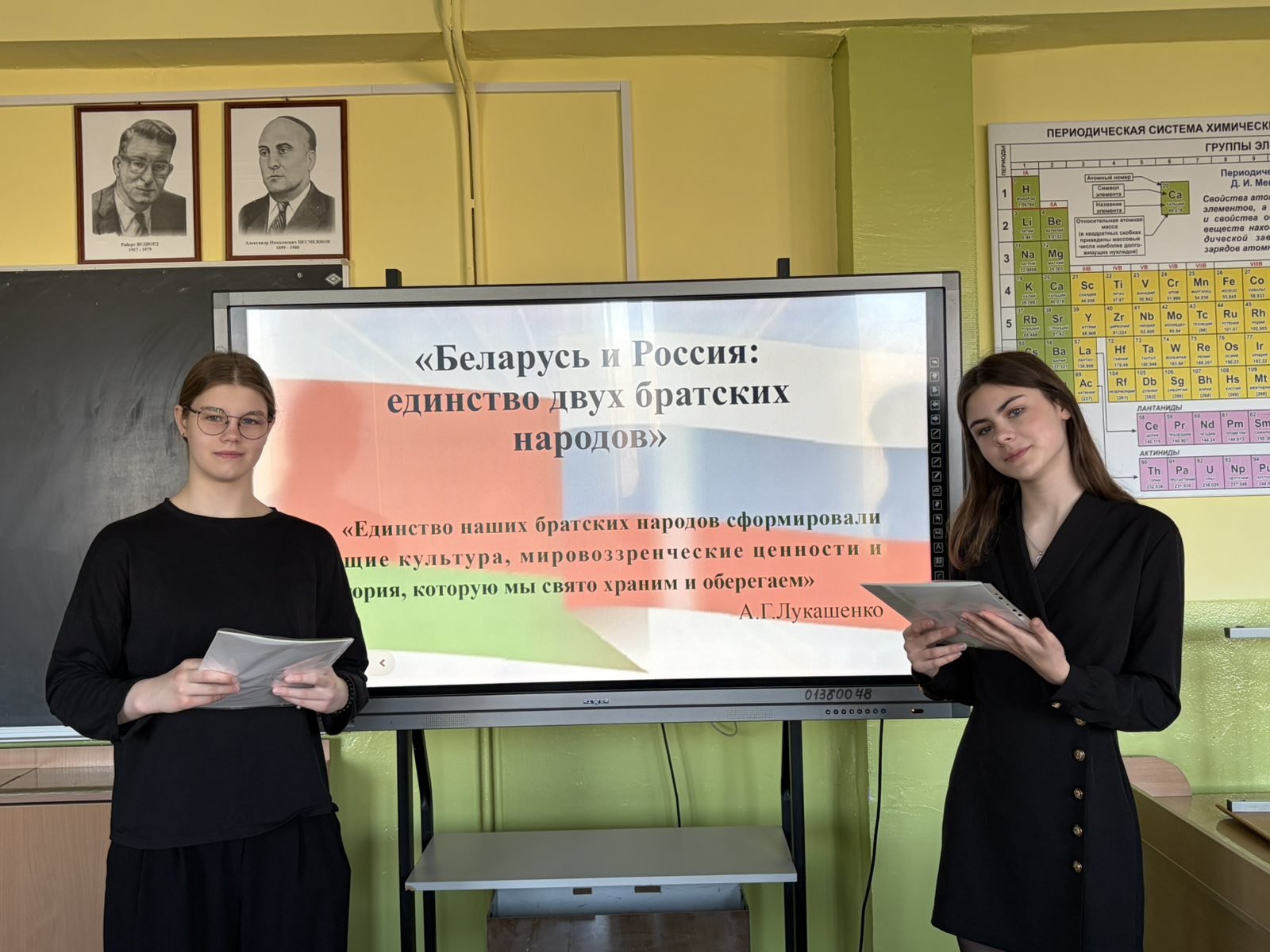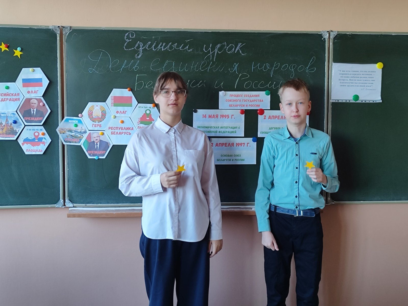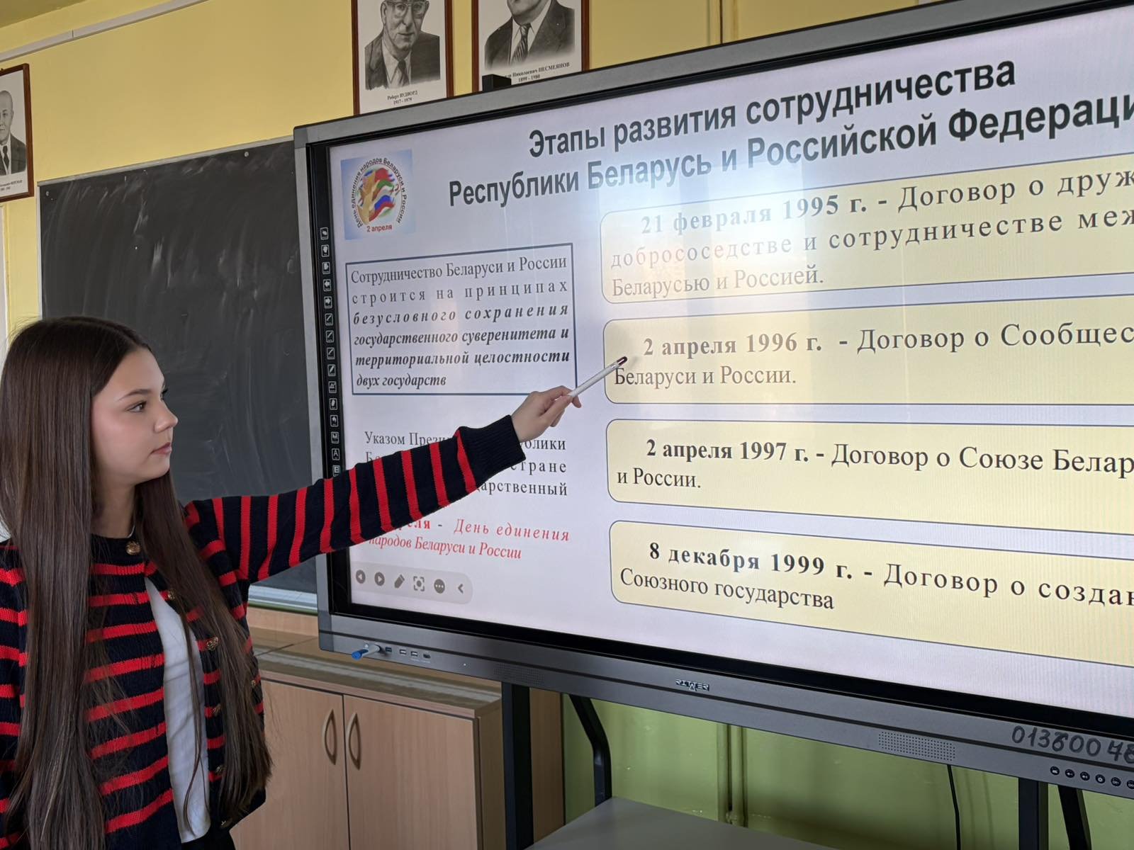 Этот праздник символизирует нашу общую историю, культурные ценности и крепкую дружбу. На уроке мы говорили о том, как важно беречь братские отношения между нашими странами, о совместных достижениях и проектах союзного государства.