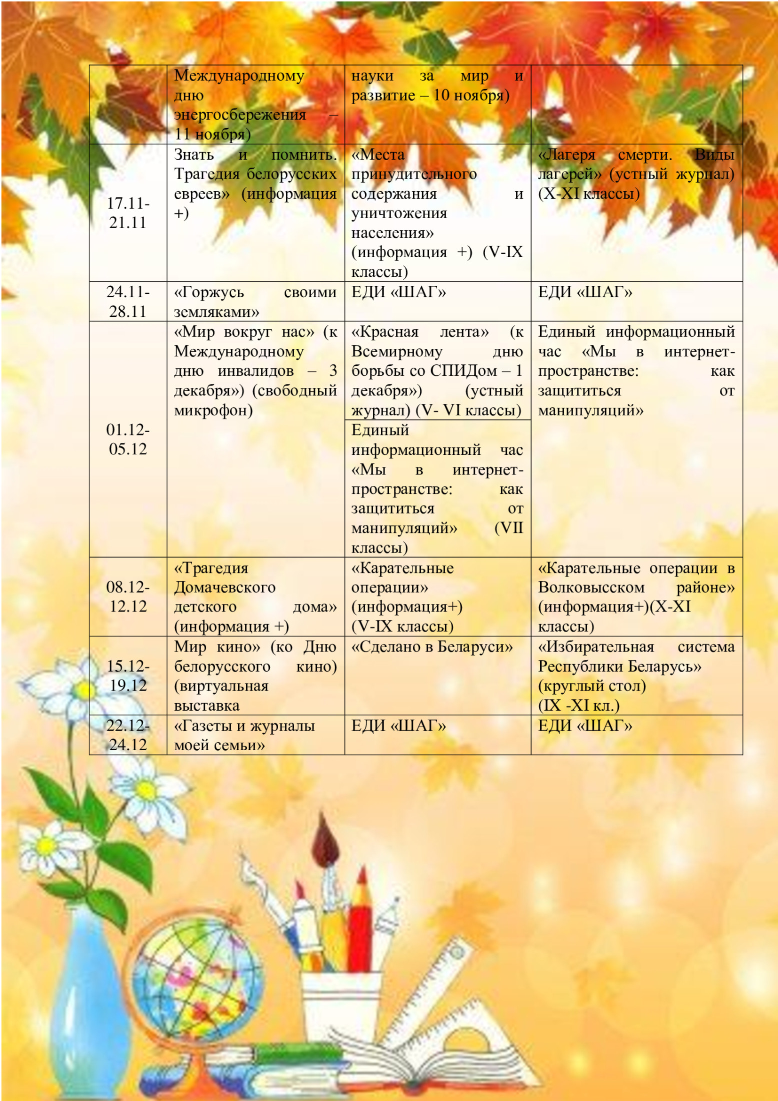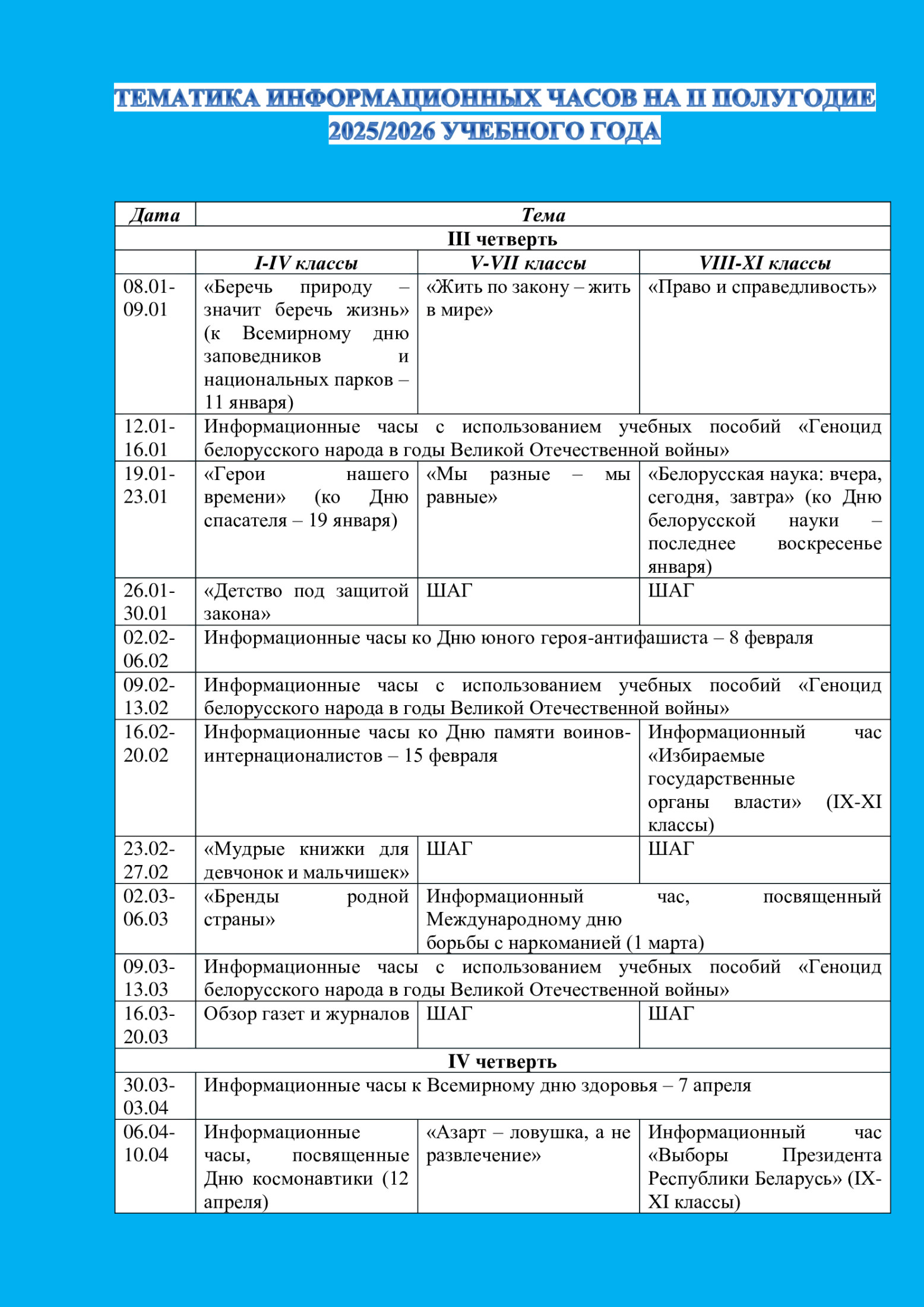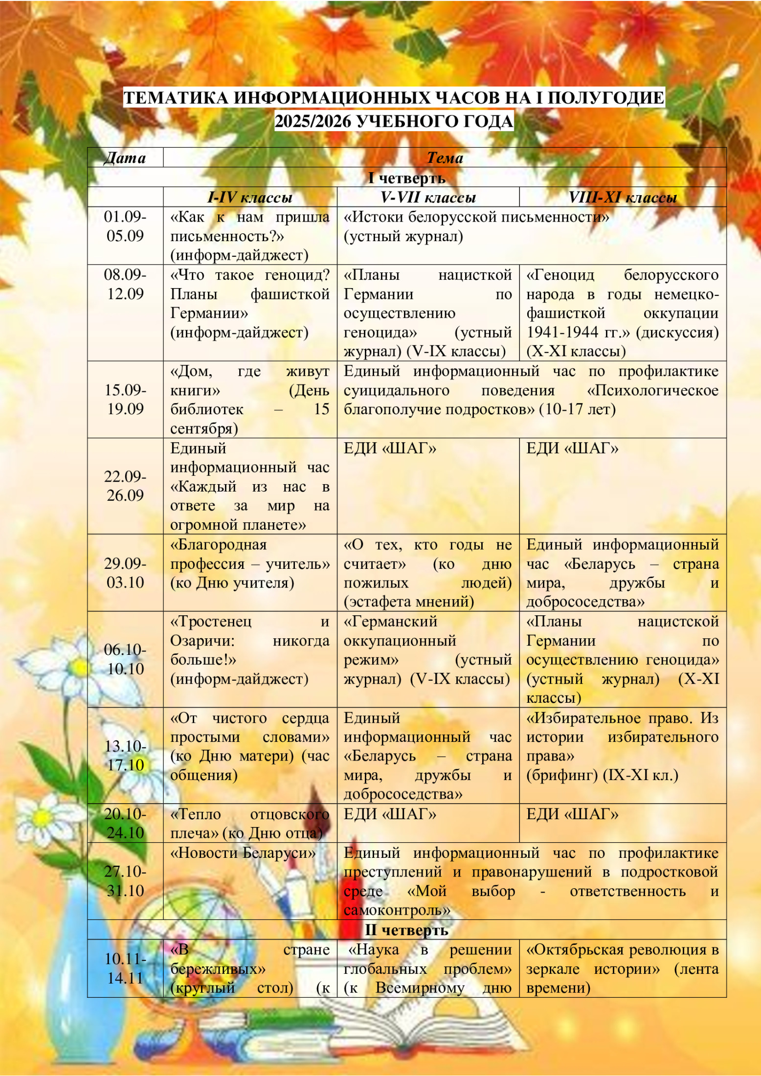 Главная Учащимся Воспитательная и социальная работа Тематика информационных часов на 2025/2026 учебный год Тематика информационных часов на 2025/2026 учебный год