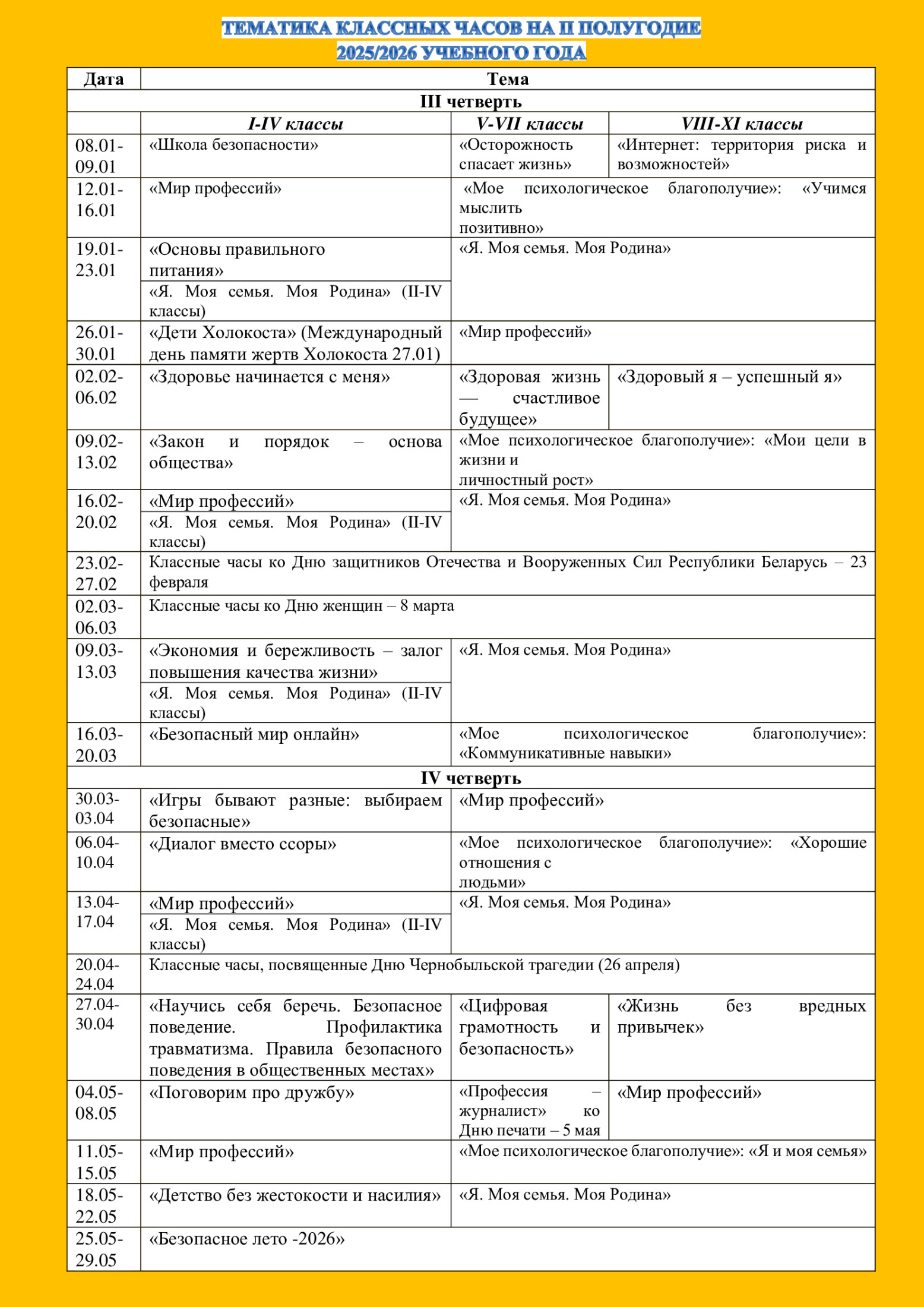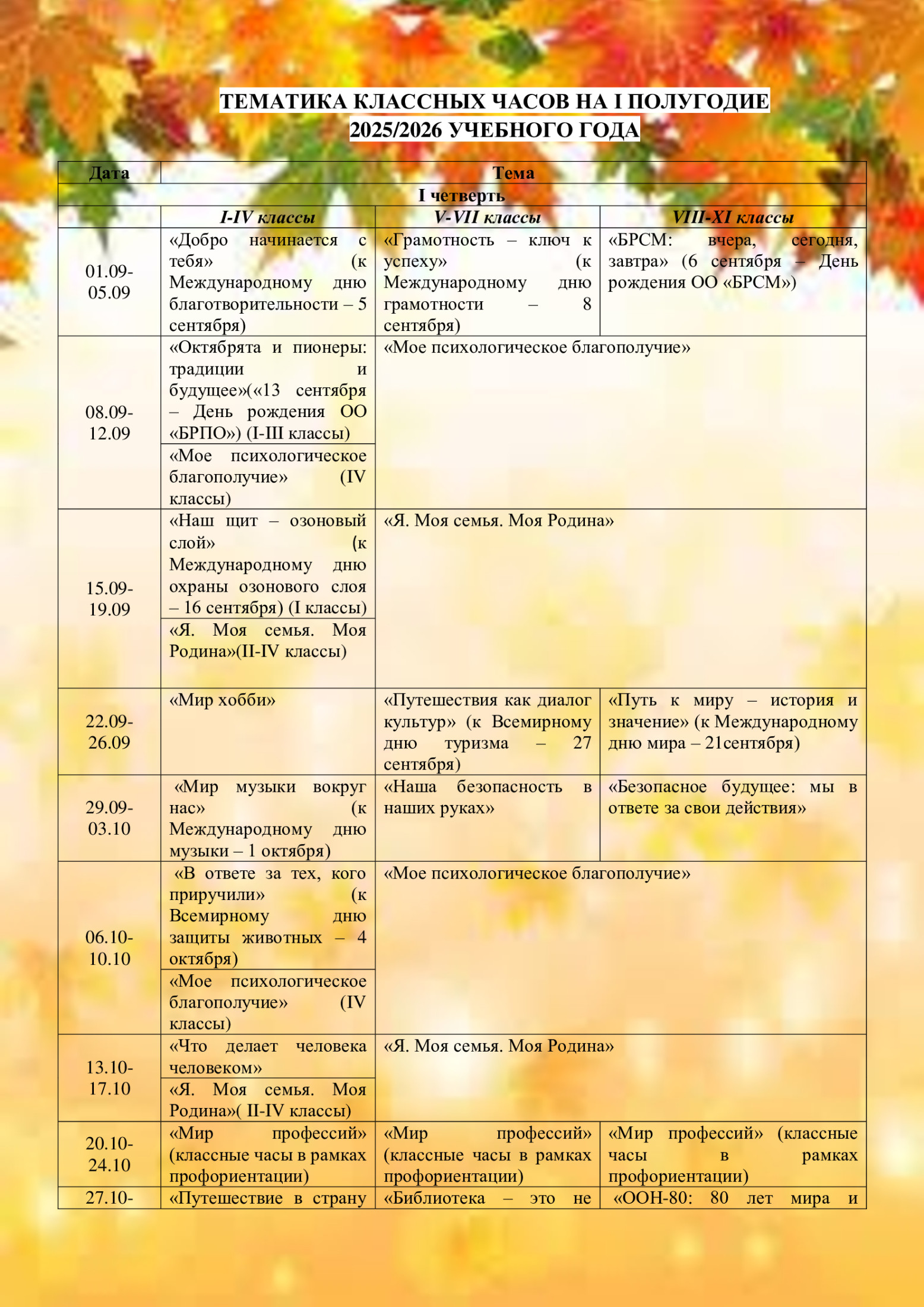 Главная Учащимся Воспитательная и социальная работа Тематика классных часов на 2025/2026 учебный год Тематика классных часов на 2025/2026 учебный год